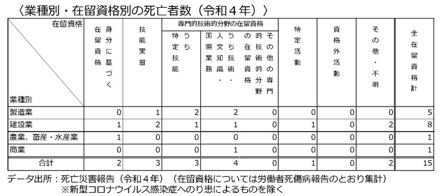他に、業種別・事故の型別の死傷者数、事故の型別・在留資格別の死傷者数などが掲載されています。